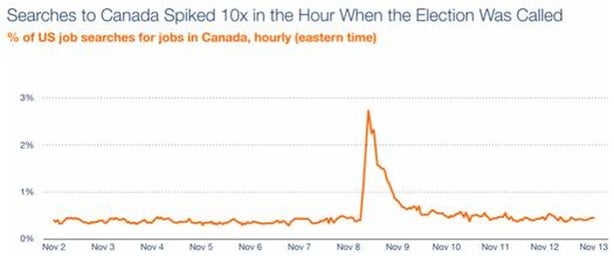 On election night the starkest reaction was the surge of interest in jobs in Canada.