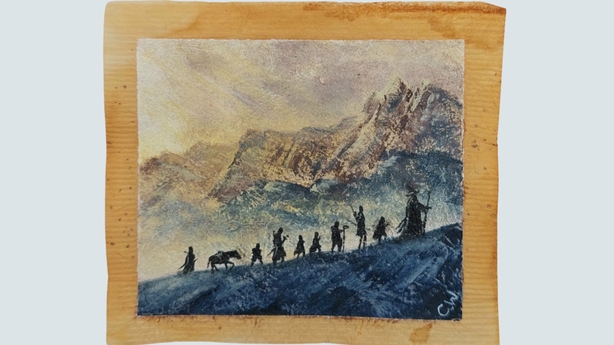The edges were then taped, the tea bags were placed on backing paper, a base layer was applied and then she used acrylic paint to create the different scenes.