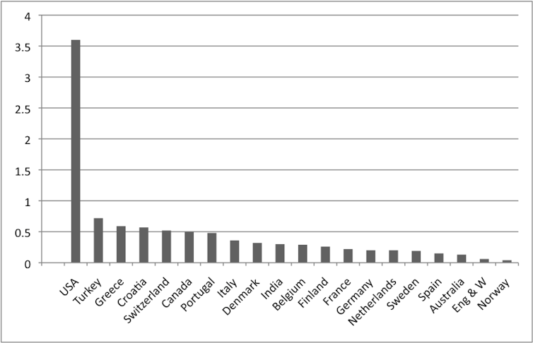 The societies above are selected to demonstrate the European range of gun homicide rates as compared with three other societies (Australia, Canada and India) and the USA. Norway, Sweden, Finland and Switzerland all have relatively high rates of gun ownership, likewise Canada and Australia, but nowhere near the US rates of gun violence. None of the European societies has been immune from the experience of "mass shooting" incidents and most have strengthened their guns laws as a consequence.