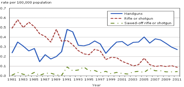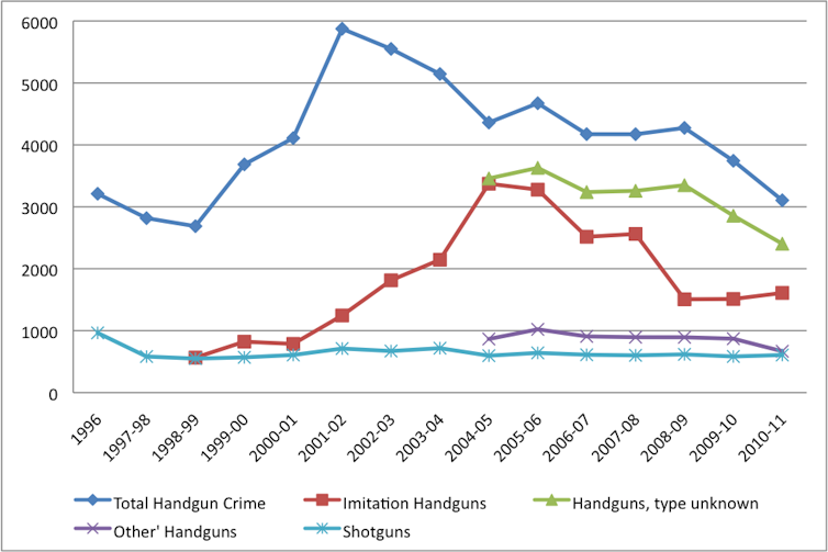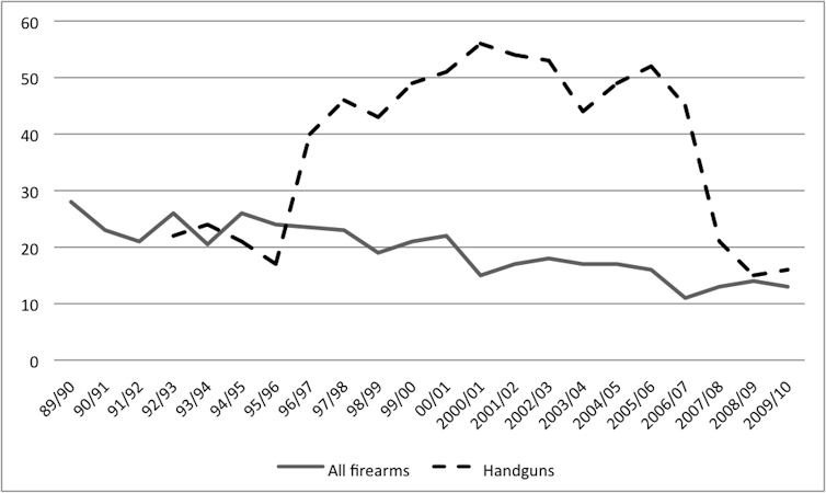 Total gun homicide has tracked generally downwards since 1995, accelerating following the gun control and firearm buyback measures after 1996. Unfortunately a rise in criminal use of handguns (linked to serious and organised crime and criminal gang activity), fortunately dropping away after 2005-6, initially dwarfed the positive results of the 1996 reforms.