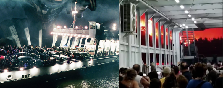One image – that of a ferry, carrying evacuees from the Greek Island of Evia, surrounded by fire, helpless and in the middle of crisis – drew comparisons to the ferry scenes in Steven Spielberg's 2005 remake of War of the Worlds. In the film, people poured onto a vehicle ferry in a desperate attempt to escape the extraterrestrial invasion.