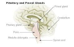 In humans, the hormone melatonin is an marker of external darkness. When darkness descends, melatonin is secreted from a structure called the pineal gland, a pine cone-shaped endocrine gland located in the center of the brain. This gland modulates sleep patterns in both circadian and seasonal rhythms. The secretion of melatonin from the gland corresponds to the length of darkness; as the nights get longer, melatonin secretion follows suit.