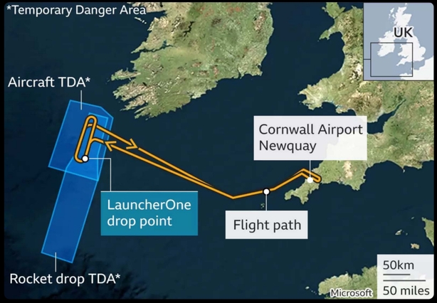 Tonight, Virgin-Orbit's Cosmic-Girl Boeing-747, carrying their Launcher-One rocket, will take off from the Spaceport Cornwall, heralding a new era in small rocketry and launching from the UK. The launch is scheduled for 23.45 hours and, weather permitting, the ignition of the rocket may be visible low in the southern sky to counties in the Republic of Ireland on a line roughly from Galway to Wexford.