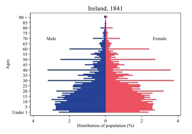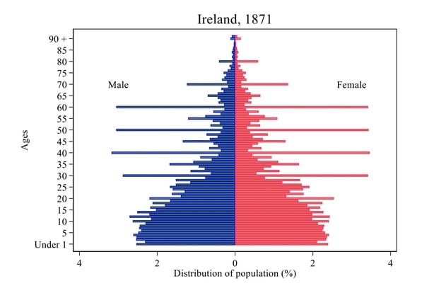 When we look at Irish censuses from the past, there is an unusual overrepresentation of people with ages ending in zero or five. This phenomenon is known as "age-heaping" or "digit preference", or even "age preference". You only have to glance at an Irish population pyramid from 1841 and 1871 to see the apparent anomalies – the picture is less of pyramid and more like a navy vessel.