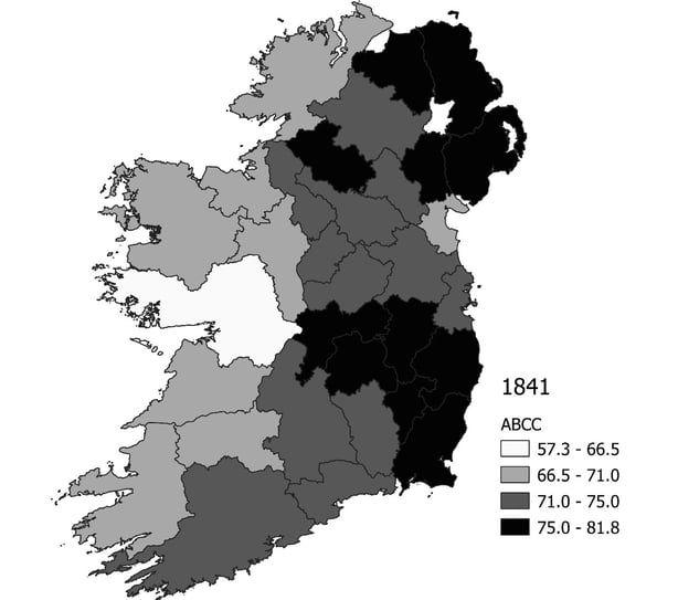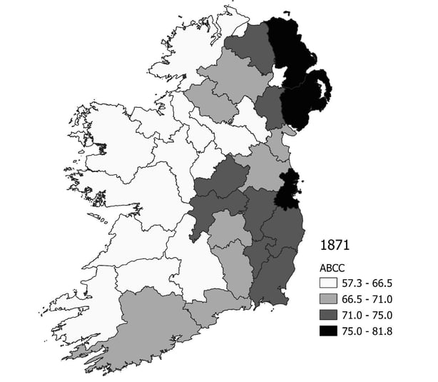 Here's the ABCC index for Ireland in 1841 and 1871. Surprisingly, Ireland’s ABCC score decreased after the famine and heaping became more pronounced. This is confusing because age heaping tends to be associated with lower levels of education and poorer communities. But Ireland had a big increase in schooling and associated literacy after the Famine and the Irish economy was growing, so why did Irish age heaping increase?