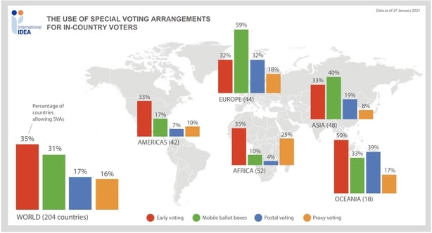 According to research done by IDEA, early voting is the alternative most used by countries worldwide, while at a European level, mobile voting is the most prevalent (59%), followed by postal voting (32%), early voting (31%), and proxy voting (18%). It’s important to note that these alternatives often aren’t available to all voters, but to specific cohorts of people.