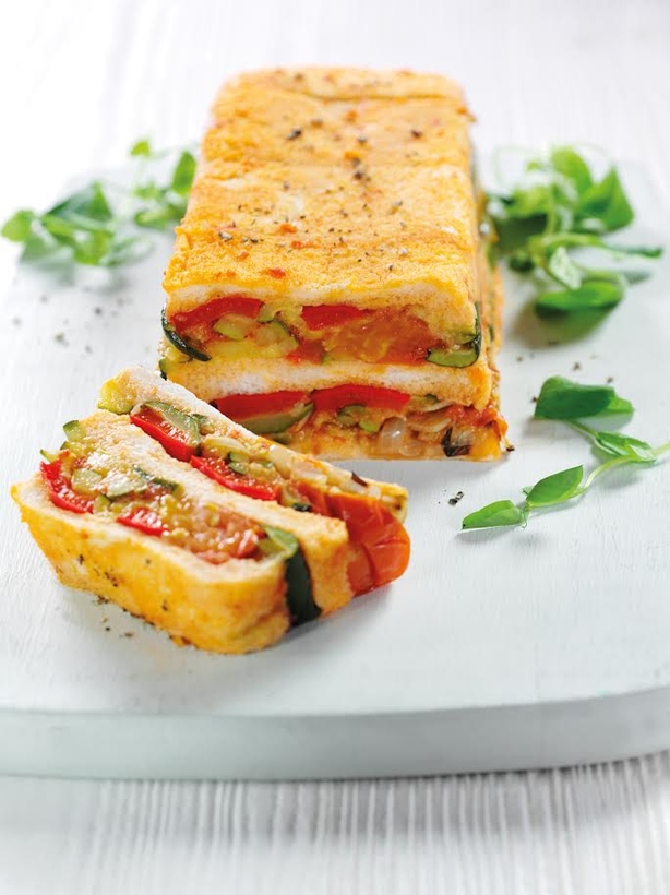 vegetable terrine that takes various ingredients layered with bread and chilled and moulded for a sliceable snack.