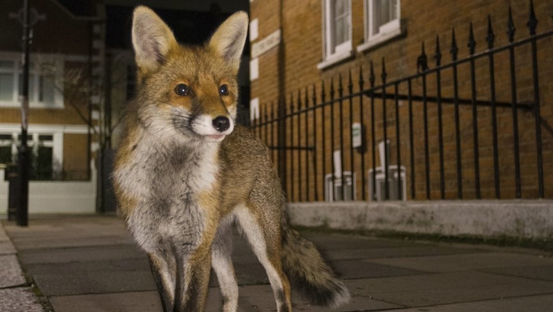 A large male fox strolled out into the road, standing, eyes locked to mine.