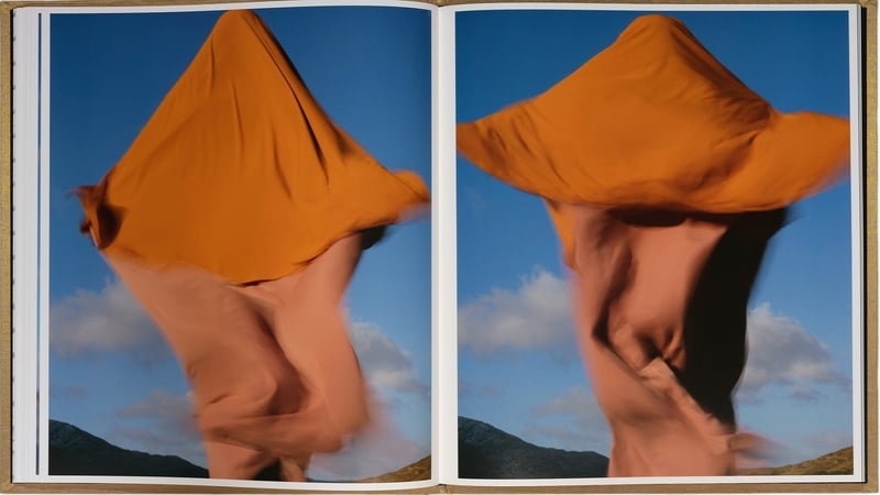Through the intense colour images of K, we follow a figure that shape-shifts as it travels across this landscape. Entirely veiled in cloth, the figure is spectral, changing in colour and materiality as it is pushed and pulled by gravity, wind, water and light. In places it appears almost gaseous, in others it is molten and then, at times, the weight of being earthbound becomes apparent.