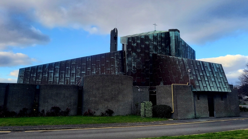 St Fintan’s Church was erected in 1973 and the contractors were Seamus and Seán Murphy. The church comprises a complex of curved, concrete buildings and is fan-shaped in plan. The volume of the space focuses at its apex over the sanctuary and altar. One enters from the south via an open portal, like a welcoming pair of out-stretched arms, into an oval, colonnaded atrium. This latter contains the slim, sculptural bell tower, which is the highest landmark in this low-lying suburban area, and a cloister-like lawn. The atrium feels processional, with sculptures of the stations of the cross against the rubbly concrete lit by small, covered skylights in the generous overhang. It is an informal social space and a threshold to the interior of the Church. Moving through it marks a transcendent journey.
