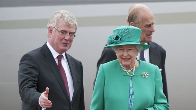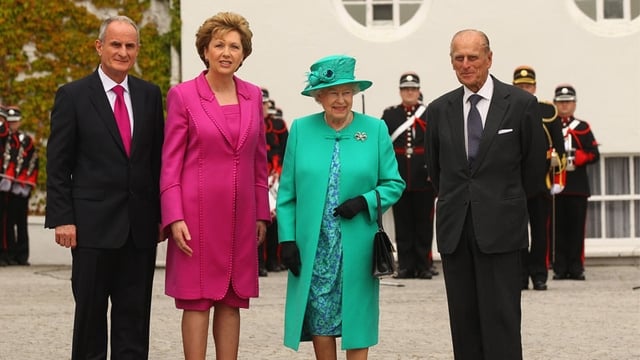 Queen Elizabeth II and her husband the Duke of Edinburgh landed at Casement Aerodrome before noon, and were welcomed by Tánaiste and Minister for Foreign Affairs Eamon Gilmore.