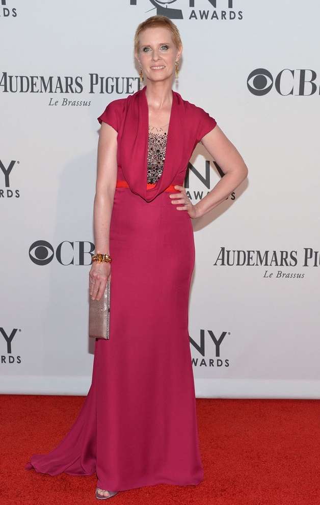 Cynthia Nixon was nominated for her role in Wit, for which she shaved her head to play a cancer patient. She looked elegant in a floor-length crimson gown with a sequin bodice underneath her cowl neck dress. The Sex in the City star who recently tied the knot to partner Christine Marinoni, accessorised her outfit with a soft pink clutch.