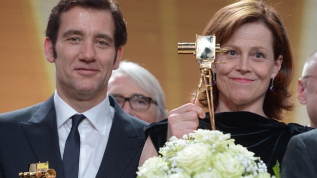 British actor Clive Owen (Best Actor International) and US actress Sigourney Weaver (Best Actress International') hold their trophies during the 48th Golden Camera Awards
