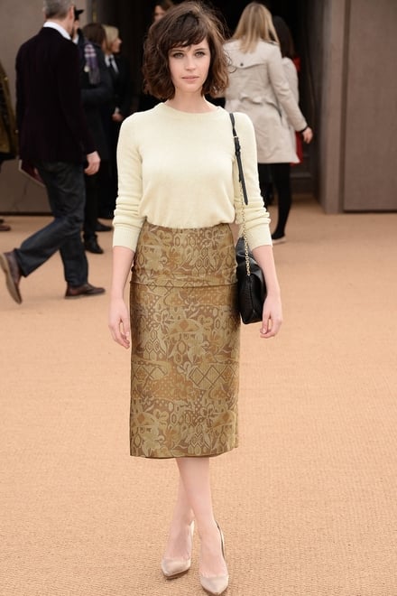 Felicity Jones looked every inch the English rose in a crew-neck jumper, ladylike skirt and nude heels.