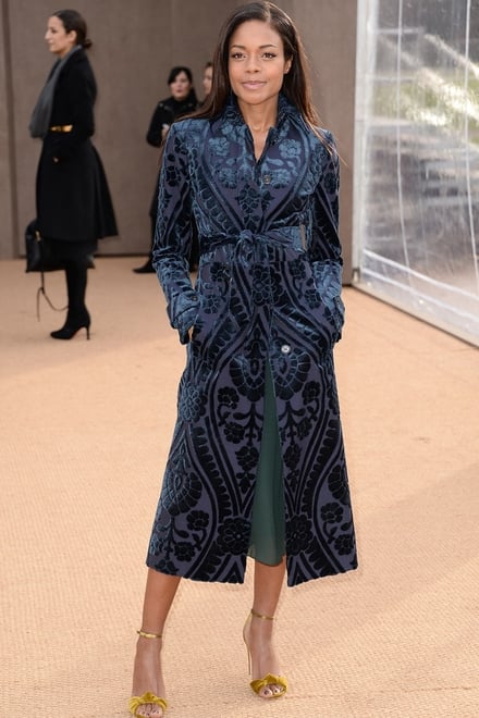 Bond star Naomi Harris looked chic sitting front row in a navy brocade coat, which she paired with a green midi dress and mustard suede strappy sandals.