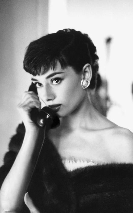 Audrey poses with a phone during a 1953 photo session at Paramount Studios.