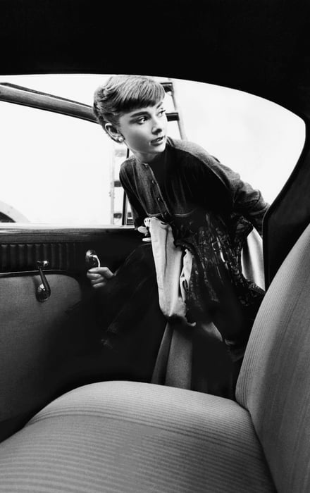 Audrey climbs into the Paramount Studios car waiting to return her to the hotel after the photo session with Bud Fraker.