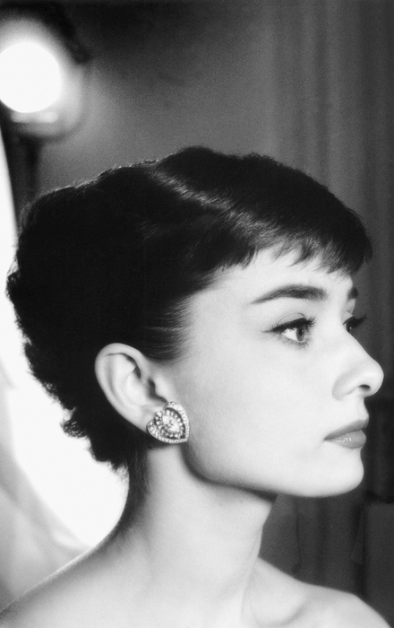 Audrey wears striking earrings during a photo session at Paramount Studios, 1953
