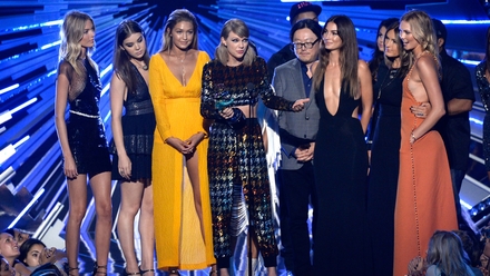 Swift was joined on stage to accept the Video of the Year award by her Bad Blood music video co-stars and close friends, Martha Hunt, Hailee Steinfeld, Gigi Hadid, Serayah, Lily Aldridge, Mariska Hargitay and Karlie Kloss, as well as the video's director, Joseph Kahn, and her collaborator, Kendrick Lamar.