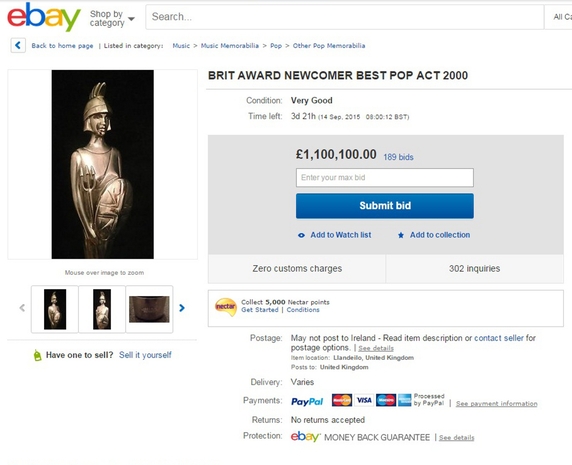 It seems there is still a lot of love for pop band 5ive as bidding for Abz' Best Newcomer Brit Award has reached a whopping €1.5 million on eBay.
