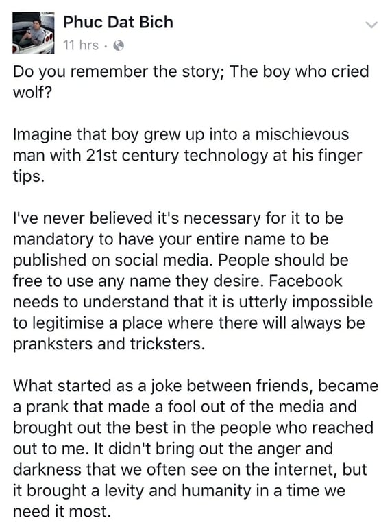 A Vietnamese man living in Melbourne who claimed that that Facebook discriminated against him over his unfortunate name 'Phuc Dat Bich' has announced that it was all a big hoax.