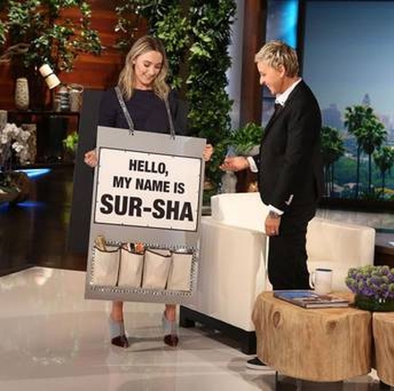 Afterwards she was presented with one of DeGeneres' special gifts – a huge wearable sign that reads, "Hello, my name is Sur-Sha". It even features special pockets for champagne bottles and snacks.