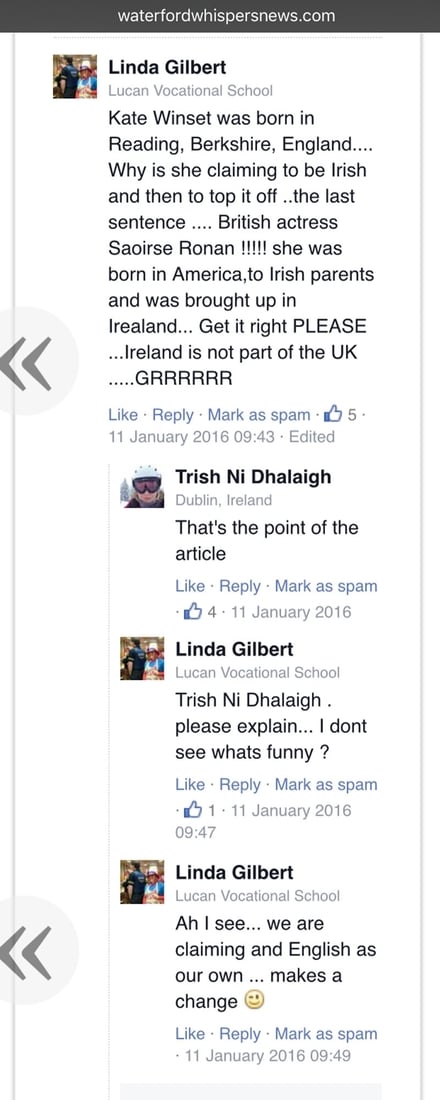 Satirical news-site Waterford Whispers responded to the controversy with an article on Monday which was headlined 'Irish Actress Kate Winslet Wins Golden Globe'. In a neat turn of the tables, it seems some people might just not have got the joke. Bless.