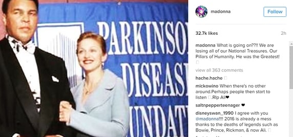 Madonna, echoing the thoughts of so many, described Ali as "The Greatest". "He shook up the World! God Bless Him," she wrote on Instagram, posting pictures of herself with the sporting and cultural icon.