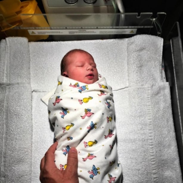 Oliver broke the happy news on Sunday, taking to social media to post a snap of his newborn son wrapped up in a white blanket with pink and yellow birds printed on it.