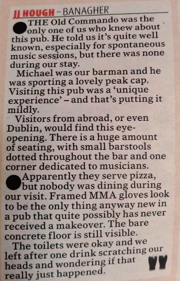 The column gives JJ Hough's pub in Banagher a measly two out of five stars and describes the experience of visiting it as "eye-opening". But not in a good way, it seems.