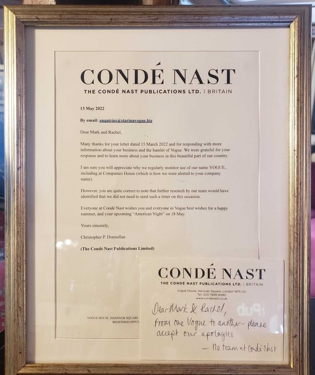 An English village pub in Cornwall has received a framed apology letter from the publisher of Vogue magazine after it requested the centuries-old establishment change its name.