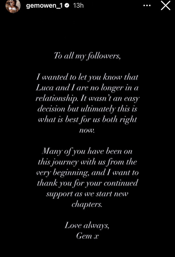 Owen, daughter of former England football player Michael Owen, wrote: "To all my followers. I wanted to let you know that Luca and I are no longer in a relationship.