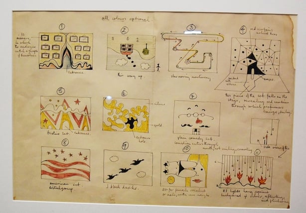 One of the designs has the handwritten description: "This piece of the set falls on the stage, revealing red curtains through which performers emerge, smiling."