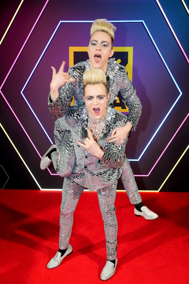 Irish singers John and Edward Grimes, better known as Jedward, added some sparkle to the red carpet in glittery suits and said they were looking forward to seeing British singer Charli XCX, who did not attend on the night despite being nominated in five categories.