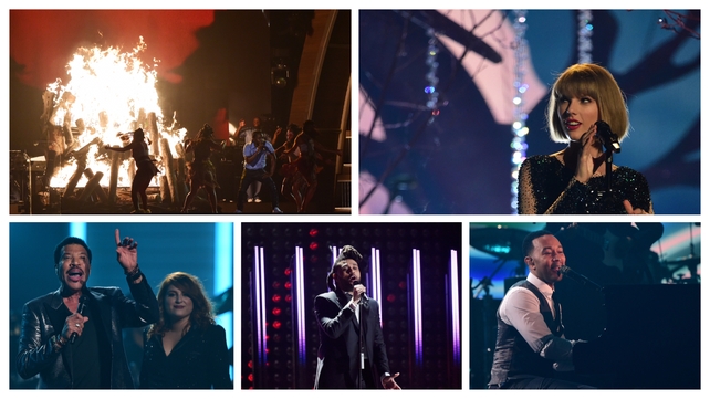 The WeekndKendrick Lamar wins the Grammy for Rap AlbumSam Hunt and Carrie UnderwoodEllie Goulding and Andra DayJohn LegendDemi LovatoJohn Legend, Demi Lovato, Lionel Richie, Meghan Trainor, Tyrese Gibson, and Luke BryanStevie WonderThe WeekndLionel RichieSelena GomezEd Sheeran wins Song of the Year for Thinking Out LoudThe Eagles and Jackson Browne pay tribute to the late Glenn FryJames Bay performs with Tori KellyKendrick Lamar performsKendrick Lamar performs