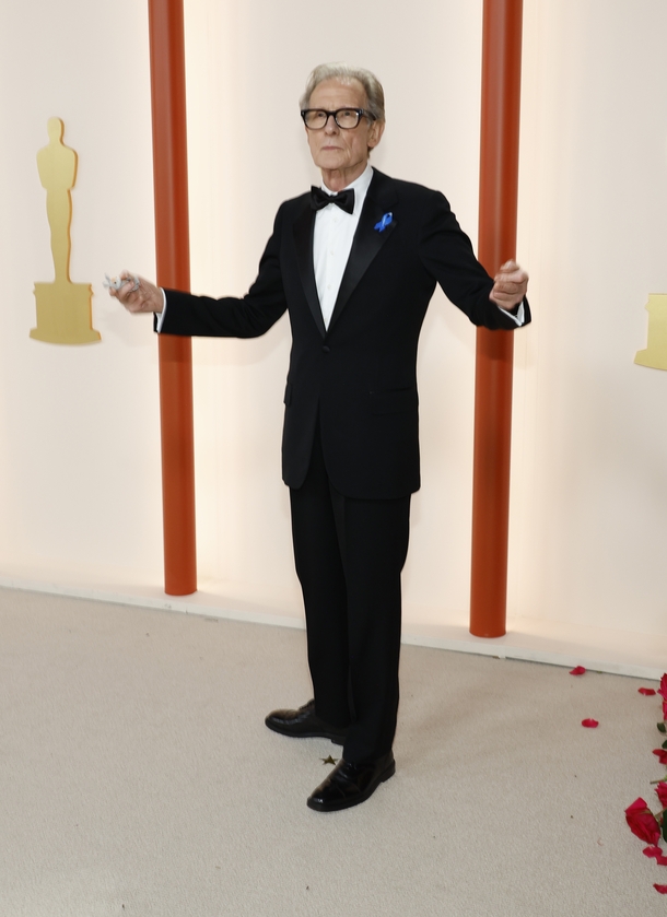 Bill Nighy, who is nominated for his first Oscar for his performance in Living, arrived at the awards wearing a blue ribbon to show support for refugees and displaced people around the world.