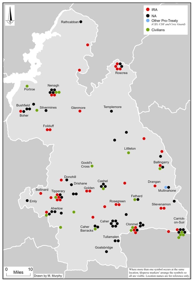 A recent study, The Civil War in County Tipperary (2021), details 175 post-War of Independence fatalities. Taking a wider field than the UCC Irish Civil War Fatalities project, it includes fatalities during the Truce, Tipperary men who died outside the county during the Civil War and fourteen men whose deaths after 24 May 1923 were related to the Civil War.