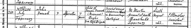 Julia French was born in Tipperary Town in March 1915. Her father Joseph, a bugler with the 3rd Rifle Brigade, was killed on 6 June 1916 during the Somme campaign. Young Julia was brought up by her mother’s family. On Sunday morning 30 July 1922, during the final day of the battle for Tipperary, seven-year-old Julia was being brought to the children’s Mass by her grandfather Neddie Martin. Passing Bank Place, Julia French was shot in the stomach and died immediately.