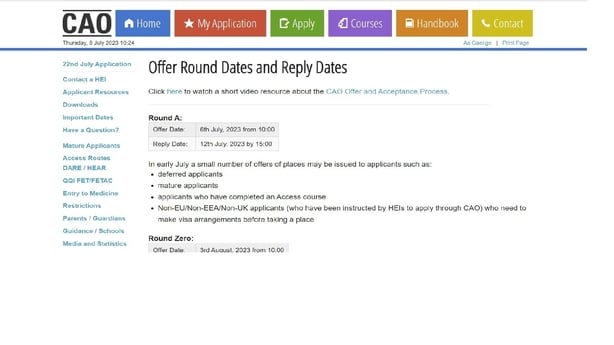 Speaking about the offer process, Head of Communications for CAO, Eileen Keleghan said; "We urge all mature, deferred and other applicants who may be expecting an offer at this stage to log in to their CAO accounts after 10am today to check if they have received a Round A offer.