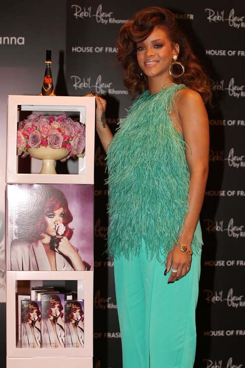 Rihanna made a feathery fashion faux-pas at the launch of her debut perfume in London yesterday.