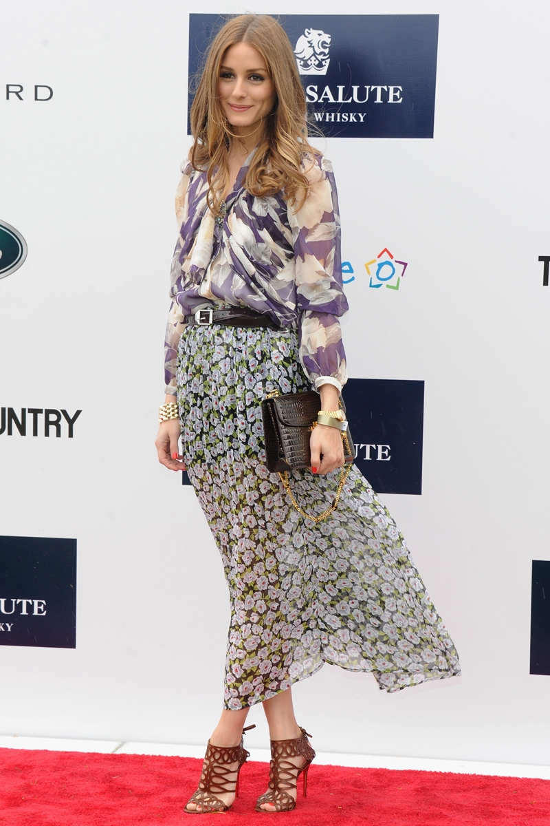 The abundance of florals can get a little tedious during summertime, but Olivia has nailed the look with a sweet chiffon midi skirt worn with a billowy blouse.
