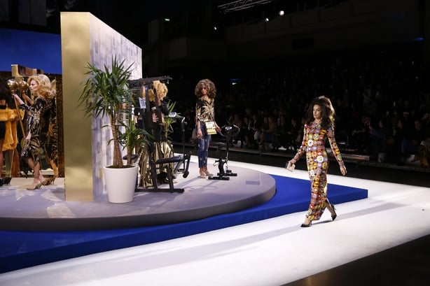 The Nineties-inspired, unashamedly glam looks matched the camp game show backdrop perfectly. Accessories were just as brilliantly excessive, with bags shaped like champagne bottles and rolled up dollar bills.