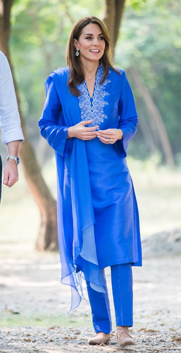 Looking radiant, Kate wore a traditional blue kurta and scarf edged with intricate white embroidery, by Maheen Khan, a Pakistani designer and costume designer. A kurta is a long loose-fitting collarless shirt, a style that originated in India.
