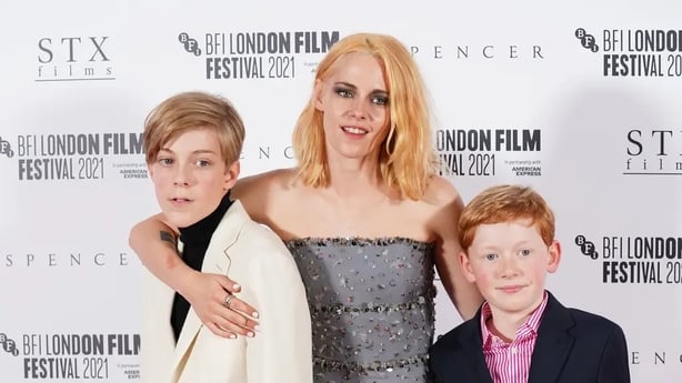 Stewart posed for pictures with Jacki Nielen, who plays the Duke of Cambridge in the film, and Freddie Spry, who plays the Duke of Sussex.