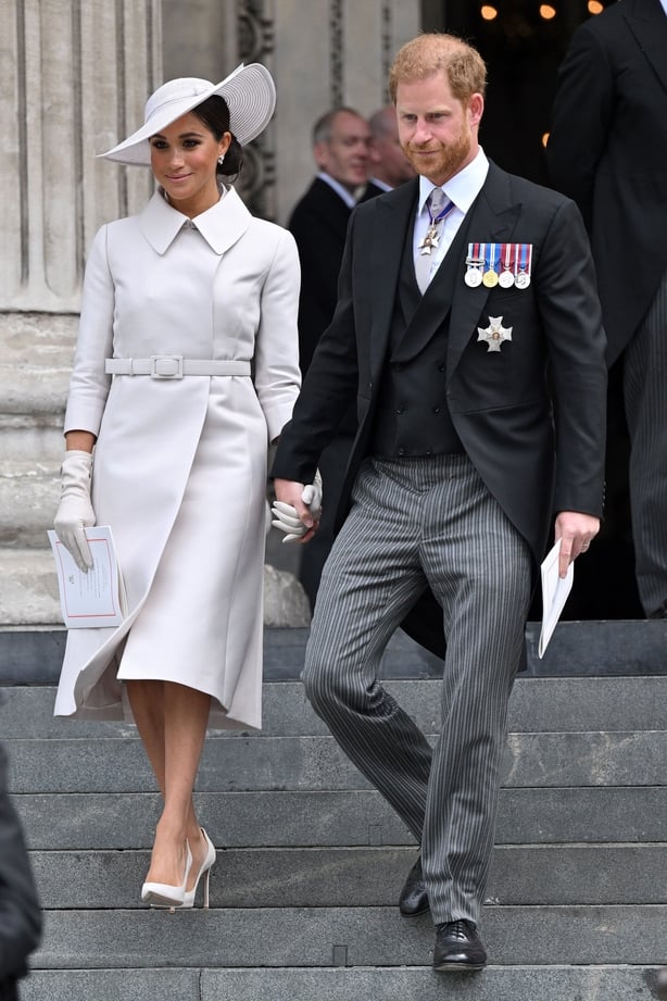 For today's event, however – the national Service of Thanksgiving for the Queen at St. Paul's Cathedral – Markle wore a dazzling ivory coat dress and matching accessories, marking a return to the formal style she used to wear as a senior royal.