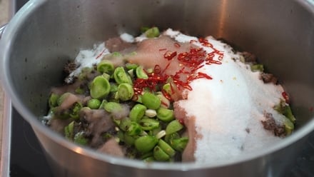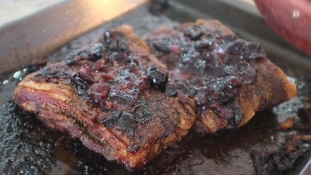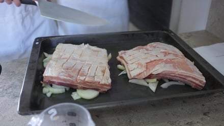With the relish and jam well underway, we prepared the Damon Glazed Pork Belly - toasting a selection of spices in a frying pan to rub on the fatty part of the belly. We placed the pork belly on a roasting dish on a bed of sliced onions, a bay leaf and sage, and put it in the oven to slow roast.