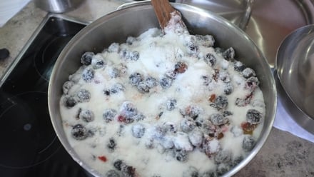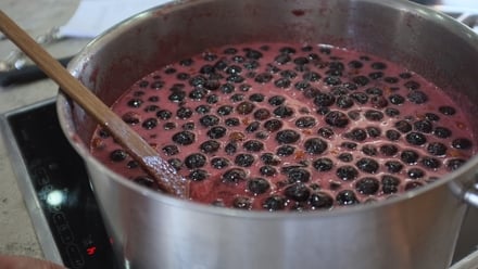 Next up we tackled the Damon Jam, made from damsons (which are like mini plums) freshly picked from hedges around the farm. It was a simple process of washing the damsons and adding them to another enormous saucepan along with equal amounts of sugar.