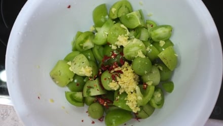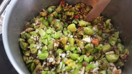 We kicked off with the simple Green Tomato Relish, chopping up fresh tomatoes from the farm, along with ginger, garlic, chilli and ginger. This all got lobbed into an enormous saucepan with sugar, vinegar and all-spice, to be gently stewed for an hour.