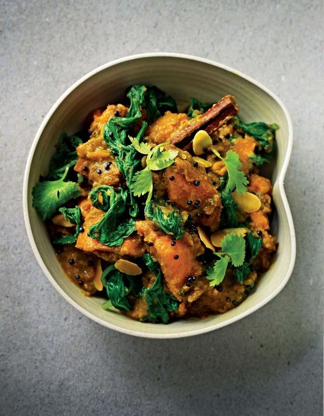 Once the spinach has wilted, the curry is ready to serve with coriander leaves, topped with flaked almonds.