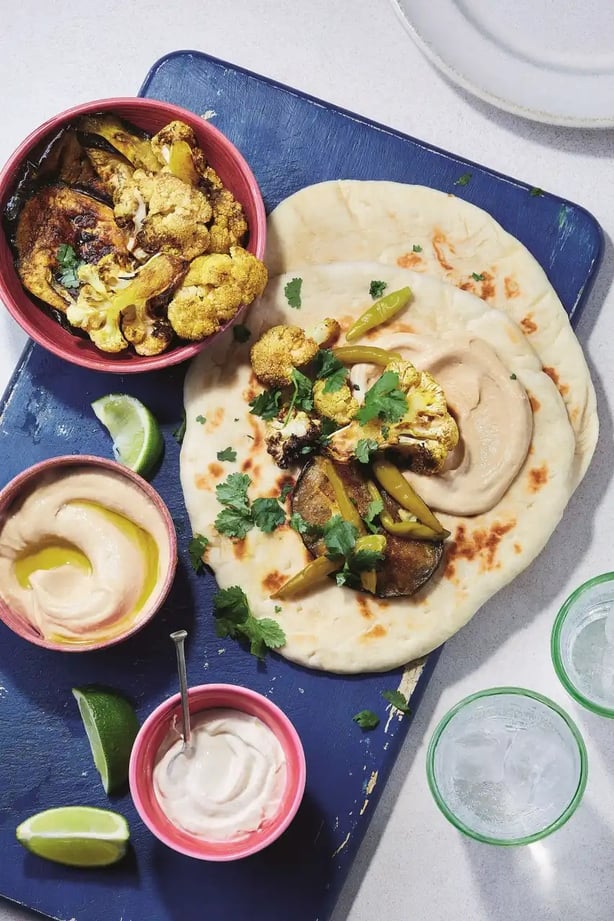 Cauliflower and aubergine flatbreads with a lime yoghurt